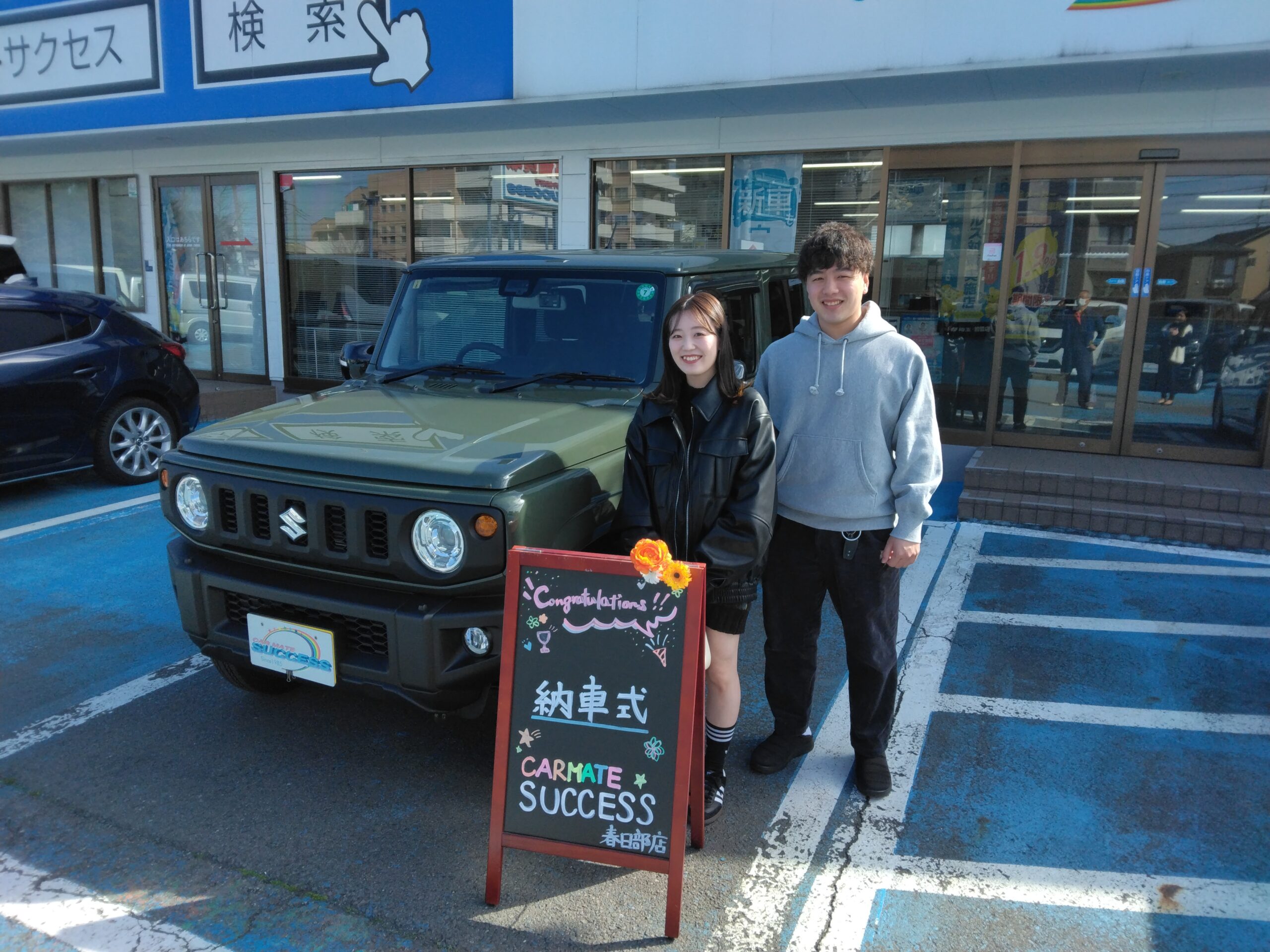 ジムニーご購入のSさんの納車日が訪れました。当日は天気も良くSさんの笑顔が素敵な納車式となりました。これから愛車ジムニーと一緒に素晴らしいカーライフを過ごして下さい。全力でバックアップします。