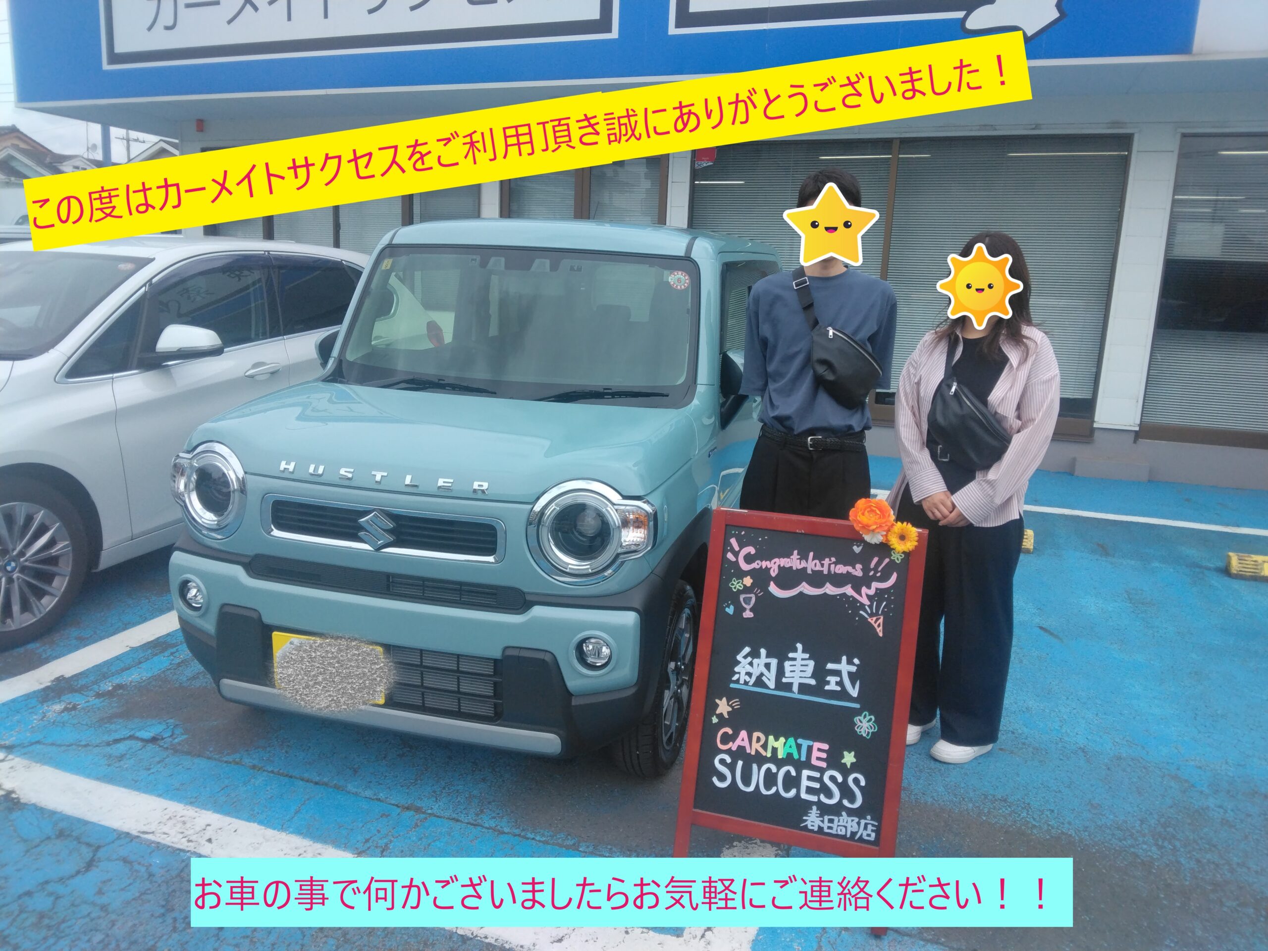 お父さんよりご紹介頂き息子さんがハスラーをご契約頂きました、ありがとうございます。そしてハスラーの納車日が来ました。これからのカーライフをサポートさせて頂きます!宜しくお願い致します。