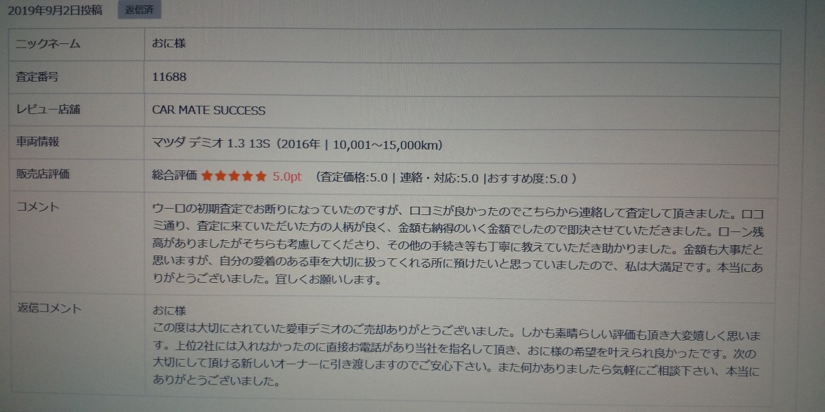 当社は買取業務に力を入れてます。当社の買取業務は買取したお車をオークションに出品して利益を出すのではなく当社の在庫として『新鮮な車の仕入』としていろいろな買取サイトに登録してお客様を募るのですが先日素晴らしい口コミを頂きましたのでご紹介したいと思います。